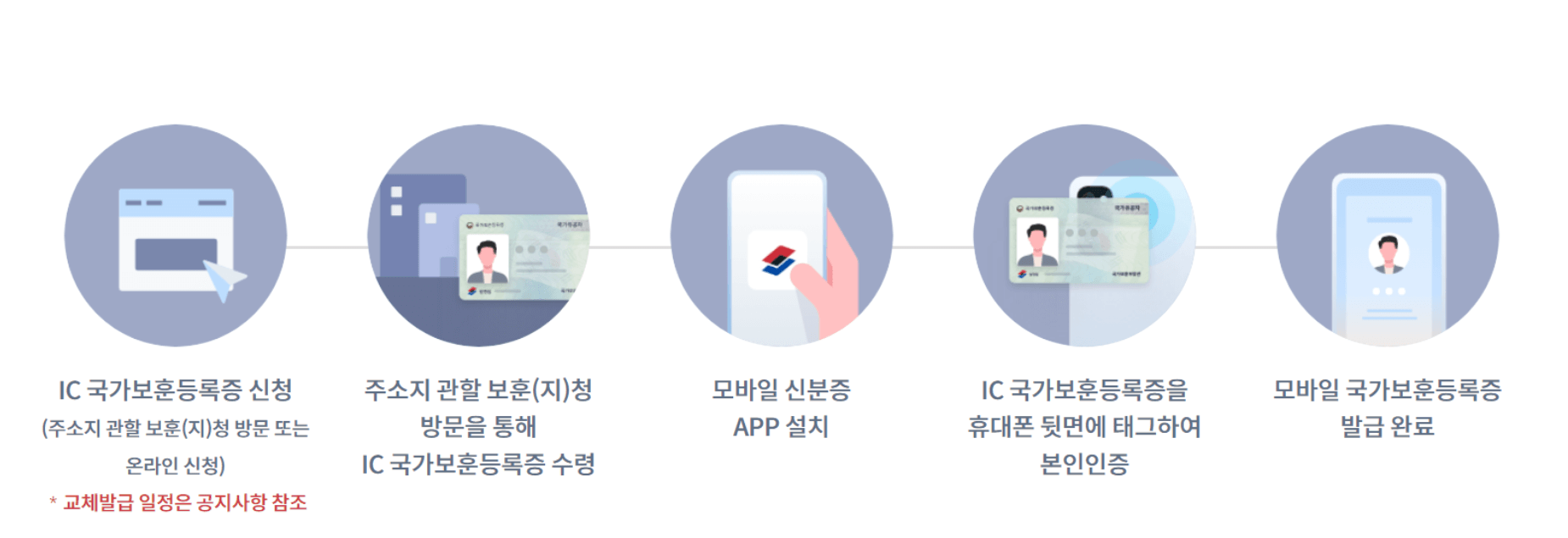 국가 유공자분은 "모바일 국가보훈 등록증"을 발급받습니다. 모바일 국가보훈 등록증 발급 방법은 한가지입니다. IC운전면허증 발급방법과 비슷합니다.