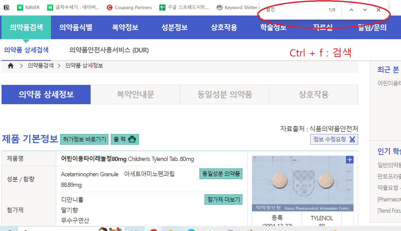 - 그냥 "Ctrl + f "를 누르고 부작용 증상을 검색합니다.